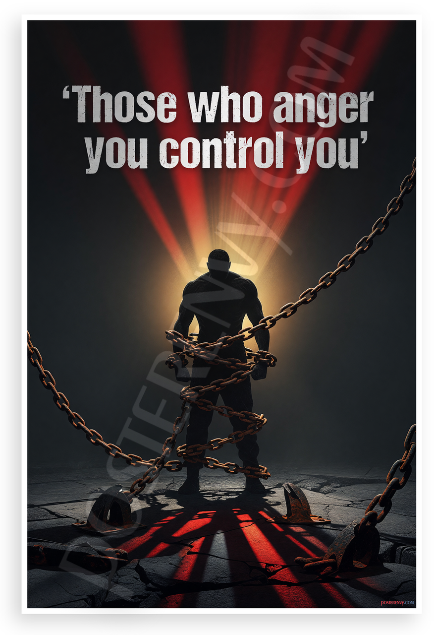 This 12x18 inch poster is printed on premium, durable paper. Proudly Made in the USA by PosterEnvy. The perfect size for any room. PosterEnvy is a family owned business, delivering top-notch posters around the world for over 20 years. Our posters are designed to last — they won't fade or pucker for years of enjoyment. Every poster features crisp, vivid artwork. We are a solar powered company. This dramatic motivational poster depicts a shadowy muscular figure bound in rusted chains against a moody gray and red backdrop with empowering golden light rays, symbolizing resilience and breaking free from control. The bold quote "Those who anger you control you" inspires emotional strength and self-mastery.