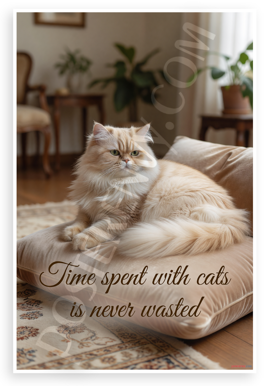 This 12x18 inch poster is printed on premium, durable paper. Proudly Made in the USA by PosterEnvy. The perfect size for any room. PosterEnvy is a family owned business, delivering top-notch posters around the world for over 20 years. Our posters are designed to last — they won't fade or pucker for years of enjoyment. Every poster features crisp, vivid artwork. We are a solar powered company. Featuring a cream-colored Persian cat lounging gracefully on a plush beige cushion in a cozy vintage room setting, overlaid with the elegant quote Time spent with cats is never wasted. The calm, reflective mood evokes warmth and pet love.