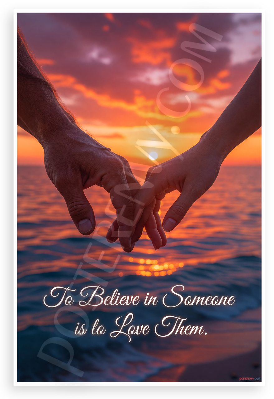 This 12x18 inch poster is printed on premium, durable paper. Proudly Made in the USA by PosterEnvy. The perfect size for any room. PosterEnvy is a family owned business, delivering top-notch posters around the world for over 20 years. Our posters are designed to last — they won't fade or pucker for years of enjoyment. Every poster features crisp, vivid artwork. We are a solar powered company. This romantic poster captures intertwined hands against a vibrant ocean sunset with the inspirational quote 'To Believe in Someone is to Love Them' in elegant script, evoking warmth, intimacy and connection.