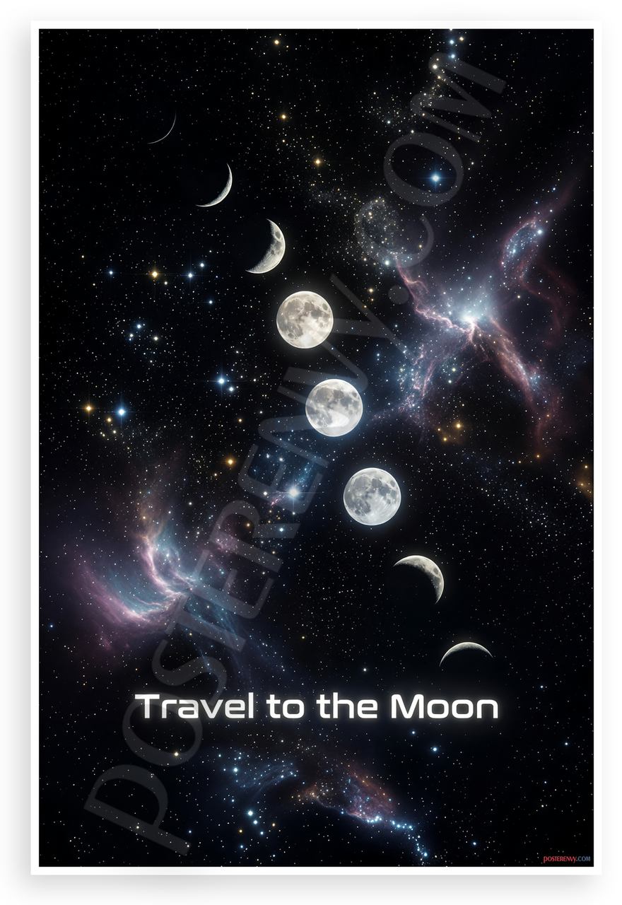 This 12x18 inch poster is printed on premium, durable paper. Proudly Made in the USA by PosterEnvy. The perfect size for any room. PosterEnvy is a family owned business, delivering top-notch posters around the world for over 20 years. Our posters are designed to last — they won't fade or pucker for years of enjoyment. Every poster features crisp, vivid artwork. We are a solar powered company. Featuring a stunning sequence of moon phases amid twinkling stars, cosmic dust, and ethereal nebulae with bold 'Travel to the Moon' text, this artwork evokes wonder and space adventure.