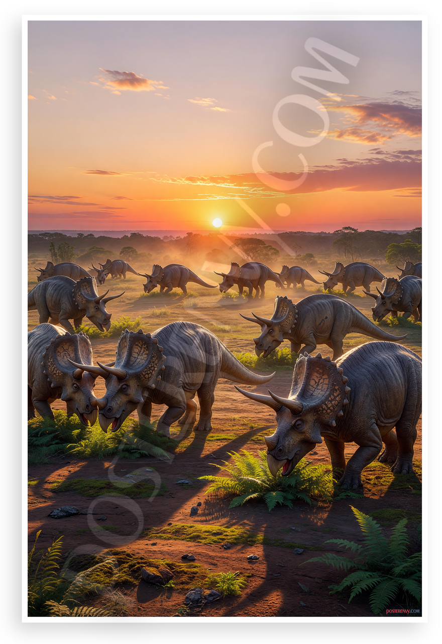 - Premium Print: This PosterEnvy 12x18 inch poster is printed on Durable, Heavy Duty Paper, Designed to last many years. Features a herd of Triceratops grazing at sunset in a prehistoric wildlife scene
