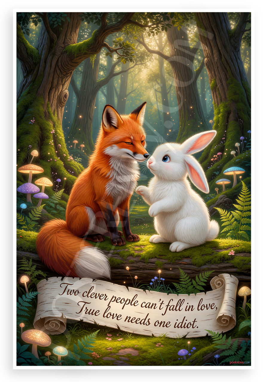 This 12x18 inch poster is printed on premium, durable paper. Proudly Made in the USA by PosterEnvy. The perfect size for any room. PosterEnvy is a family owned business, delivering top-notch posters around the world for over 20 years. Our posters are designed to last — they won't fade or pucker for years of enjoyment. Every poster features crisp, vivid artwork. We are a solar powered company. This whimsical illustration captures a clever red fox and adorable white rabbit in a tender moment amid a lush enchanted forest with glowing mushrooms, fireflies, and soft sunlight filtering through ancient trees. The playful quote on a scroll adds a humorous twist to romance.