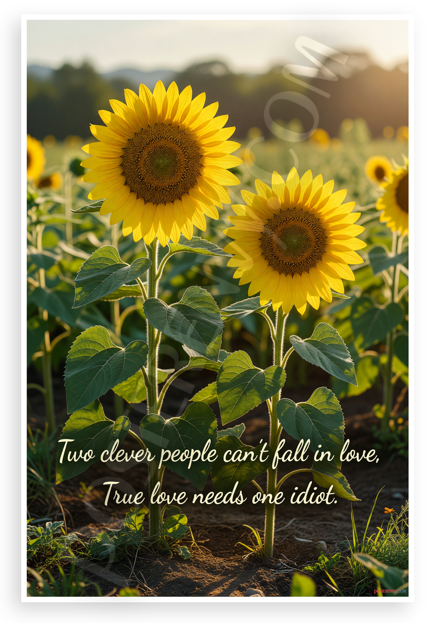 This 12x18 inch poster is printed on premium, durable paper. Proudly Made in the USA by PosterEnvy. The perfect size for any room. PosterEnvy is a family owned business, delivering top-notch posters around the world for over 20 years. Our posters are designed to last — they won't fade or pucker for years of enjoyment. Every poster features crisp, vivid artwork. We are a solar powered company. Featuring two vibrant sunflowers in a sunlit field with the witty quote 'Two clever people can’t fall in love, True love needs one idiot.' overlaid in elegant script, this poster blends natural beauty with humorous romance insight.