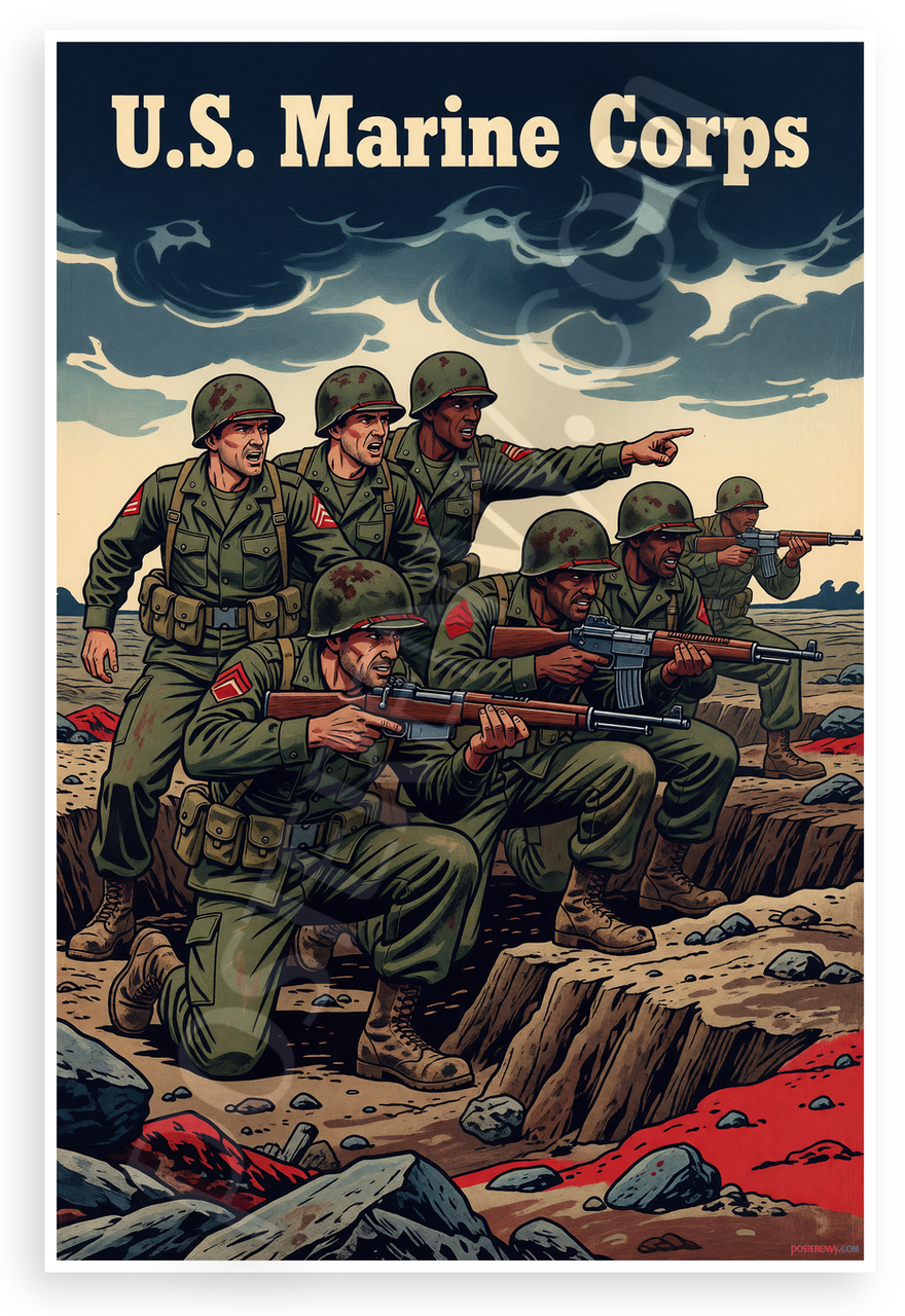 This 12x18 inch poster is printed on premium, durable paper. Proudly Made in the USA by PosterEnvy. The perfect size for any room. PosterEnvy is a family owned business, delivering top-notch posters around the world for over 20 years. Our posters are designed to last — they won't fade or pucker for years of enjoyment. Every poster features crisp, vivid artwork. We are a solar powered company. This vintage woodblock print style poster depicts U.S. Marines in heroic combat positions on a rugged battlefield with dramatic clouds and pointing gestures, evoking patriotism and teamwork. Ideal for military enthusiasts.