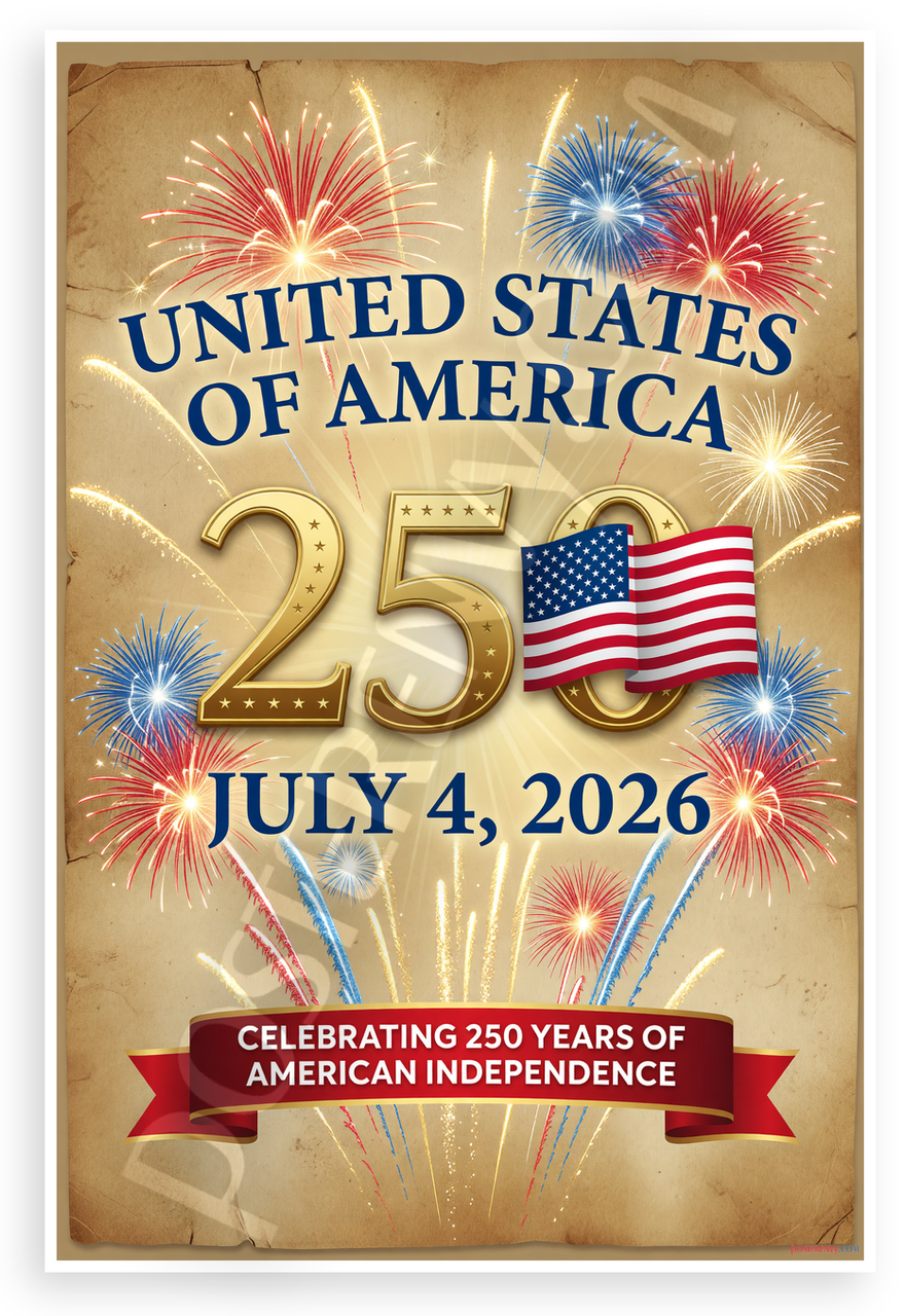 - Patriotic Celebration Design: Vibrant fireworks explode around the golden 250 and waving American flag on a textured beige background with bold text United States of America and July 4 2026 banner. Evokes pride and festivity, ideal for home offices, garages, or patriotic rooms