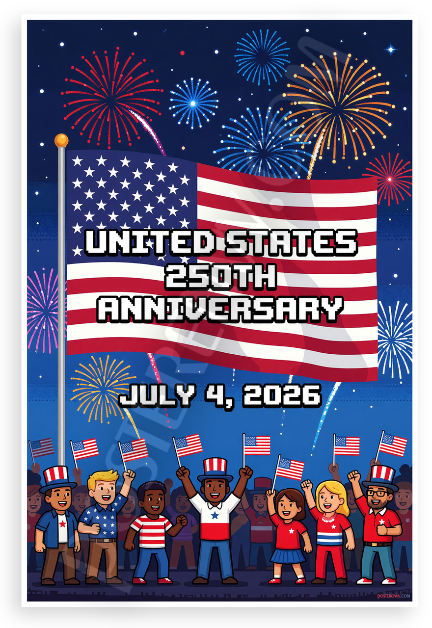This 12x18 inch poster is printed on premium, durable paper. Proudly Made in the USA by PosterEnvy. The perfect size for any room. PosterEnvy is a family owned business, delivering top-notch posters around the world for over 20 years. Our posters are designed to last — they won't fade or pucker for years of enjoyment. Every poster features crisp, vivid artwork. We are a solar powered company. Celebrate America's 250th anniversary with this vibrant pixel art design featuring the American flag, fireworks, diverse crowd waving flags, and bold text for July 4, 2026.