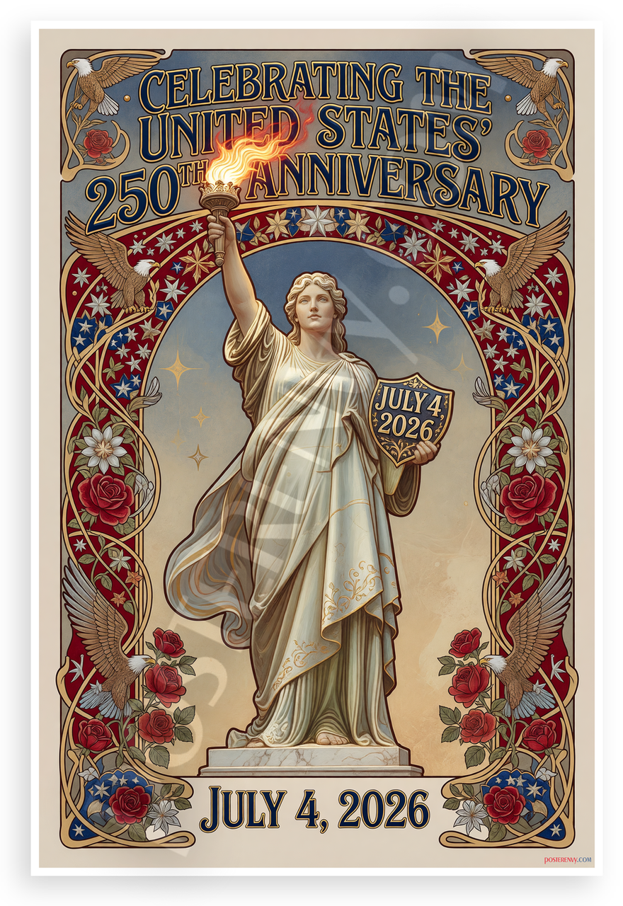 This 12x18 inch poster is printed on premium, durable paper. Proudly Made in the USA by PosterEnvy. The perfect size for any room. PosterEnvy is a family owned business, delivering top-notch posters around the world for over 20 years. Our posters are designed to last — they won't fade or pucker for years of enjoyment. Every poster features crisp, vivid artwork. We are a solar powered company. Celebrate America's 250th anniversary on July 4, 2026 with this stunning Art Nouveau design featuring the Statue of Liberty holding a torch and shield, flanked by eagles, roses, and stars in patriotic red, white, and blue tones.