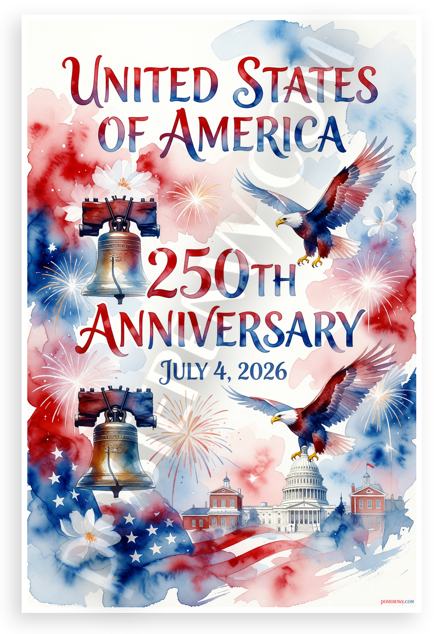 This 12x18 inch poster is printed on premium, durable paper. Proudly Made in the USA by PosterEnvy. The perfect size for any room. PosterEnvy is a family owned business, delivering top-notch posters around the world for over 20 years. Our posters are designed to last — they won't fade or pucker for years of enjoyment. Every poster features crisp, vivid artwork. We are a solar powered company. Celebrate America's 250th anniversary on July 4, 2026 with this stunning watercolor design featuring bald eagles, Liberty Bell, Capitol building, fireworks and stars. Patriotic red white blue tones create an inspiring festive mood.
