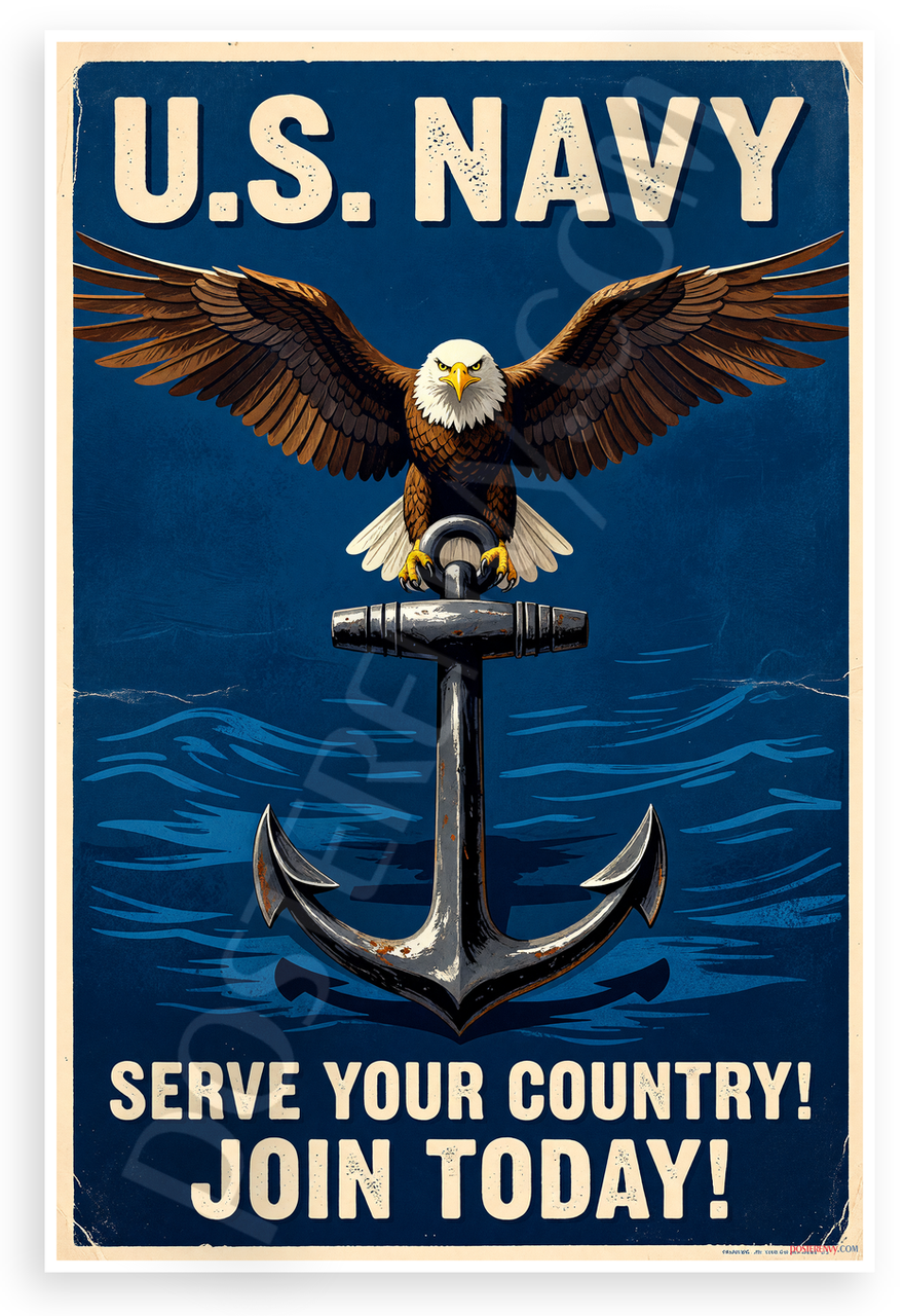 This 12x18 inch poster is printed on premium, durable paper. Proudly Made in the USA by PosterEnvy. The perfect size for any room. PosterEnvy is a family owned business, delivering top-notch posters around the world for over 20 years. Our posters are designed to last — they won't fade or pucker for years of enjoyment. Every poster features crisp, vivid artwork. We are a solar powered company. This vintage-style poster showcases a majestic bald eagle perched on a nautical anchor amid ocean waves, with bold 'U.S. Navy' lettering and motivational text 'Serve Your Country! Join Today!' in a proud, patriotic design evoking steadfast naval tradition.