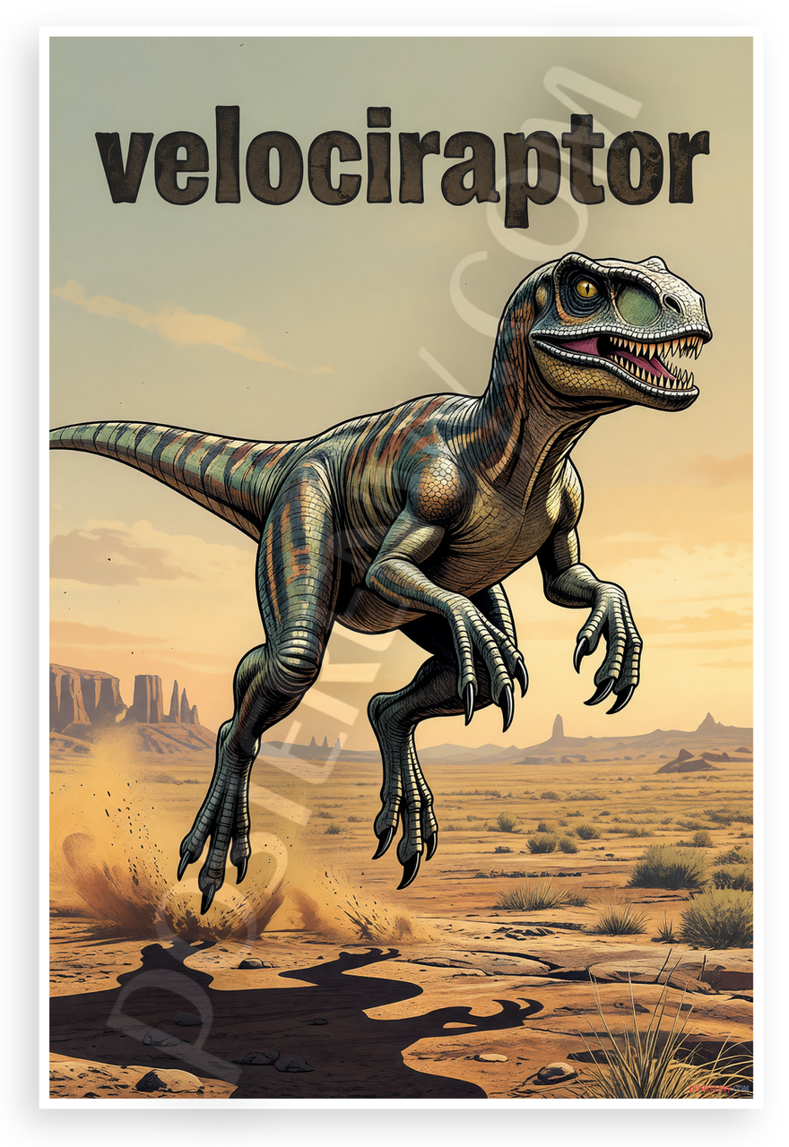 - Dynamic Prehistoric Scene: Illustrated velociraptor with fierce expression and striped patterns lunges over dusty badlands and rock spires. Perfect for kids rooms, play areas, or science-themed spaces