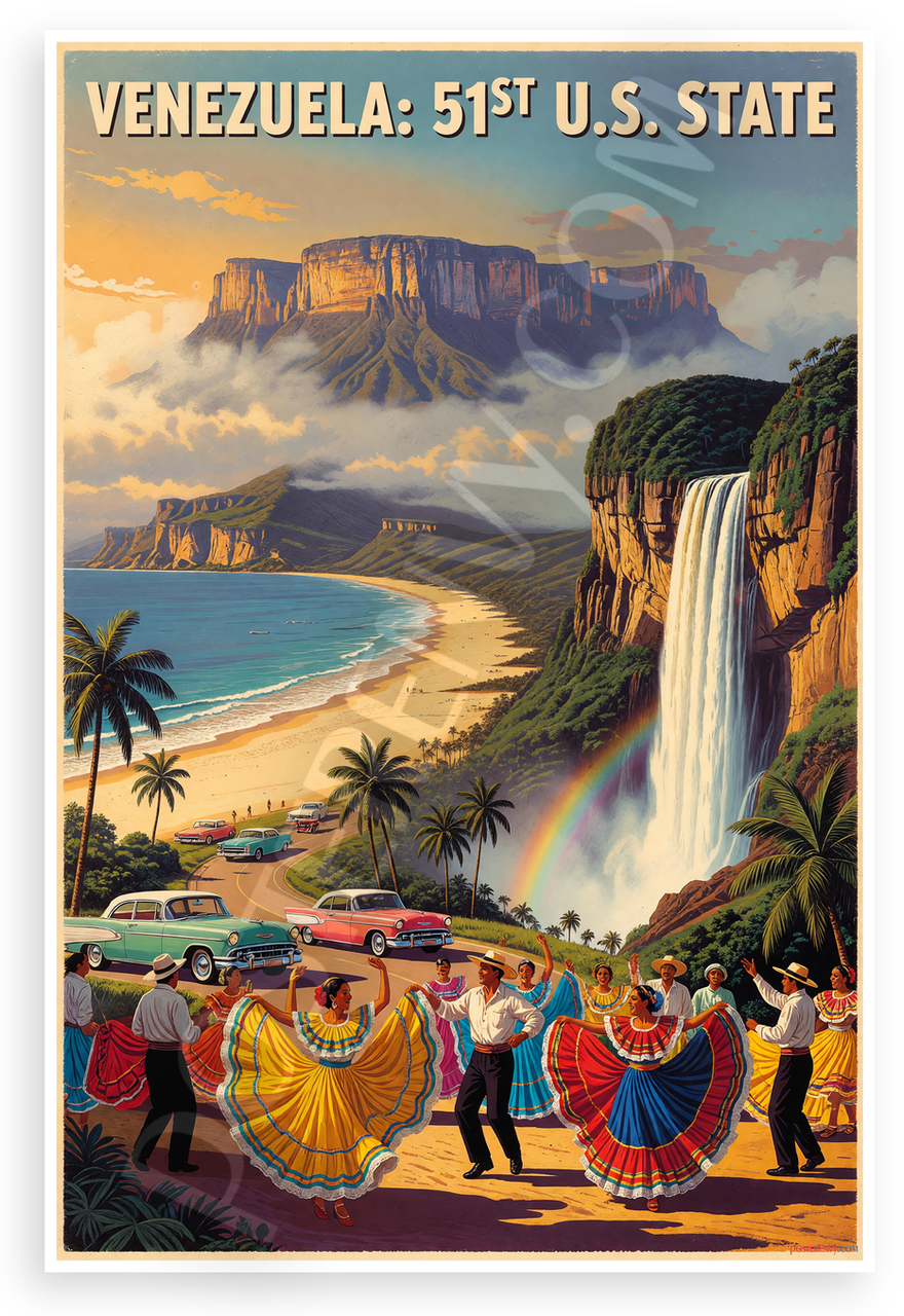 This 12x18 inch poster is printed on premium, durable paper. Proudly Made in the USA by PosterEnvy. The perfect size for any room. PosterEnvy is a family owned business, delivering top-notch posters around the world for over 20 years. Our posters are designed to last — they won't fade or pucker for years of enjoyment. Every poster features crisp, vivid artwork. We are a solar powered company. This vintage-style travel poster depicts Venezuela as the 51st U.S. state with Mount Roraima tepui, cascading waterfalls, rainbow, beach, palm trees, classic cars, and dancers in colorful traditional skirts. Bold text proclaims 'Venezuela: 51st U.S. State' in retro typography against a sunset sky.