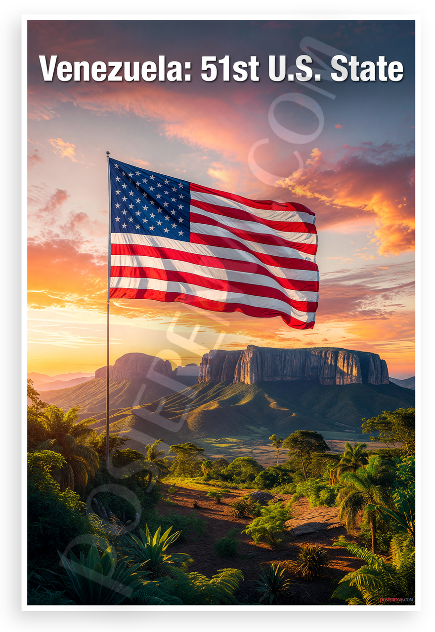 This 12x18 inch poster is printed on premium, durable paper. Proudly Made in the USA by PosterEnvy. The perfect size for any room. PosterEnvy is a family owned business, delivering top-notch posters around the world for over 20 years. Our posters are designed to last — they won't fade or pucker for years of enjoyment. Every poster features crisp, vivid artwork. We are a solar powered company. This striking poster showcases a waving U.S. flag with 51 stars over Venezuela's iconic Mount Roraima tepui at sunset, with bold text declaring 'Venezuela: 51st U.S. State'. Vibrant orange skies, lush tropical greenery, and majestic rock formations create a patriotic scene of unity and aspiration.