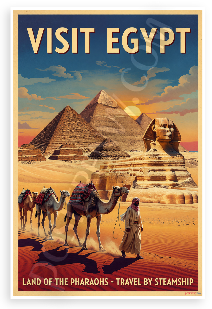 This 12x18 inch poster is printed on premium, durable paper. Proudly Made in the USA by PosterEnvy. The perfect size for any room. PosterEnvy is a family owned business, delivering top-notch posters around the world for over 20 years. Our posters are designed to last — they won't fade or pucker for years of enjoyment. Every poster features crisp, vivid artwork. We are a solar powered company. This vintage-style travel poster captures the iconic Egyptian landscape with majestic pyramids, the Great Sphinx, a caravan of camels led by a robed figure, and a golden sunset over the desert sands. Bold text proclaims 'Visit Egypt - Land of the Pharaohs - Travel by Steamer' in classic retro typography.