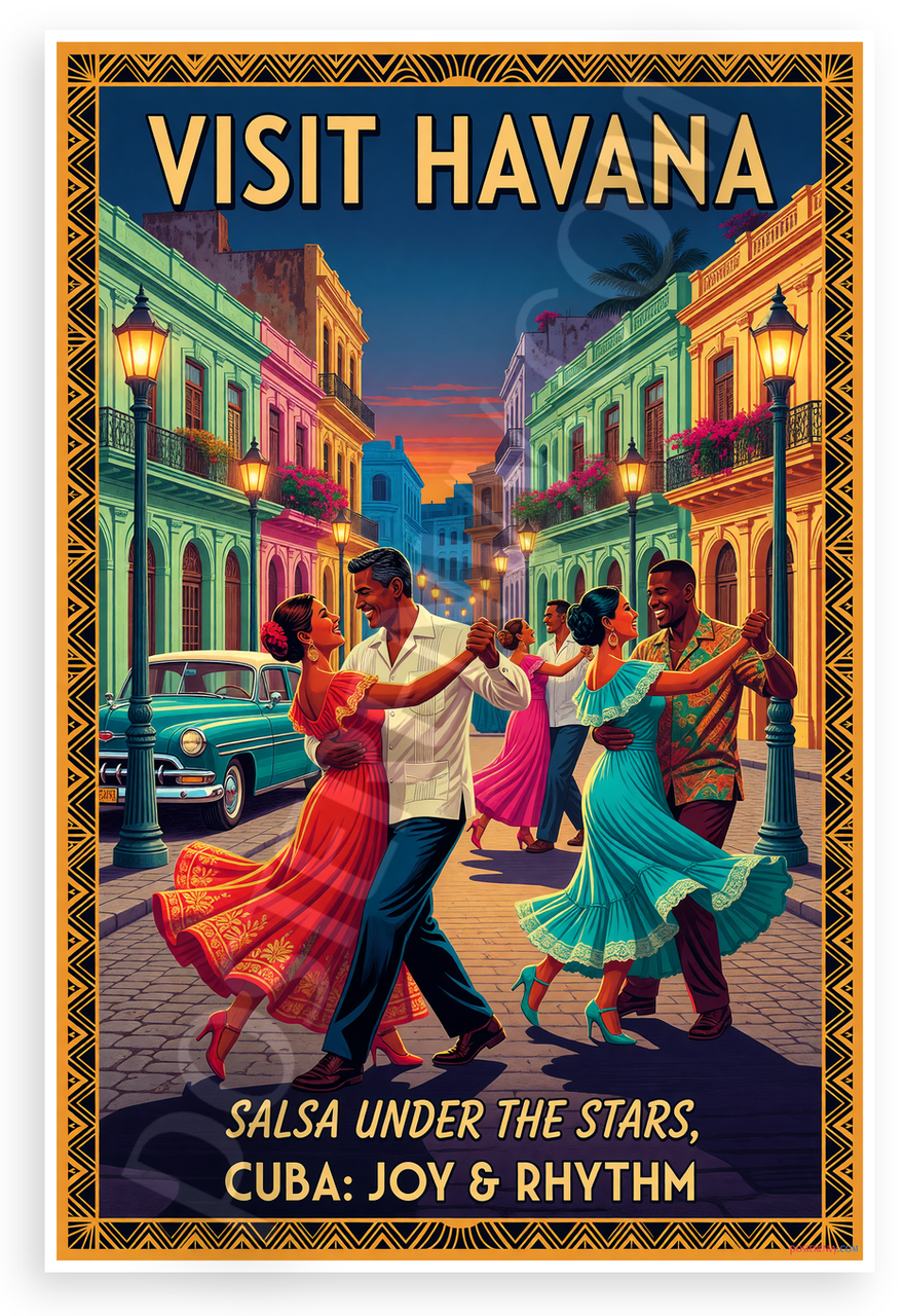 This 12x18 inch poster is printed on premium, durable paper. Proudly Made in the USA by PosterEnvy. The perfect size for any room. PosterEnvy is a family owned business, delivering top-notch posters around the world for over 20 years. Our posters are designed to last — they won't fade or pucker for years of enjoyment. Every poster features crisp, vivid artwork. We are a solar powered company. This vibrant vintage-style travel poster captures lively salsa dancers in a colorful Havana street at dusk, with Art Deco borders, classic cars, and sunset skies evoking joy and rhythm. Ideal for adding tropical energy to your space.