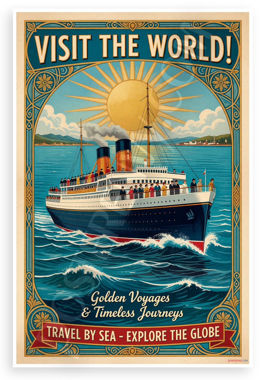 This 12x18 inch poster is printed on premium, durable paper. Proudly Made in the USA by PosterEnvy. The perfect size for any room. PosterEnvy is a family owned business, delivering top-notch posters around the world for over 20 years. Our posters are designed to last — they won't fade or pucker for years of enjoyment. Every poster features crisp, vivid artwork. We are a solar powered company. This vintage-style travel poster depicts a majestic ocean liner sailing through waves under a radiant sun, with ornate borders and bold text proclaiming 'Visit the World!' and 'Travel by Sea - Explore the Globe'. Evokes adventure and wanderlust with blue, gold, and red tones.