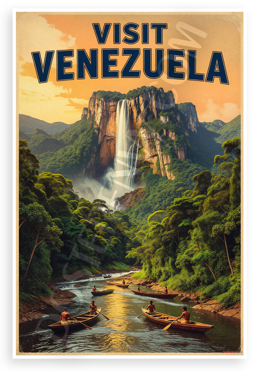 - Vintage Travel Design: Bold text Visit Venezuela over dramatic Angel Falls waterfall, lush jungle mountains, river canoes at sunset; evokes adventure wanderlust ideal for living room office or travel nook