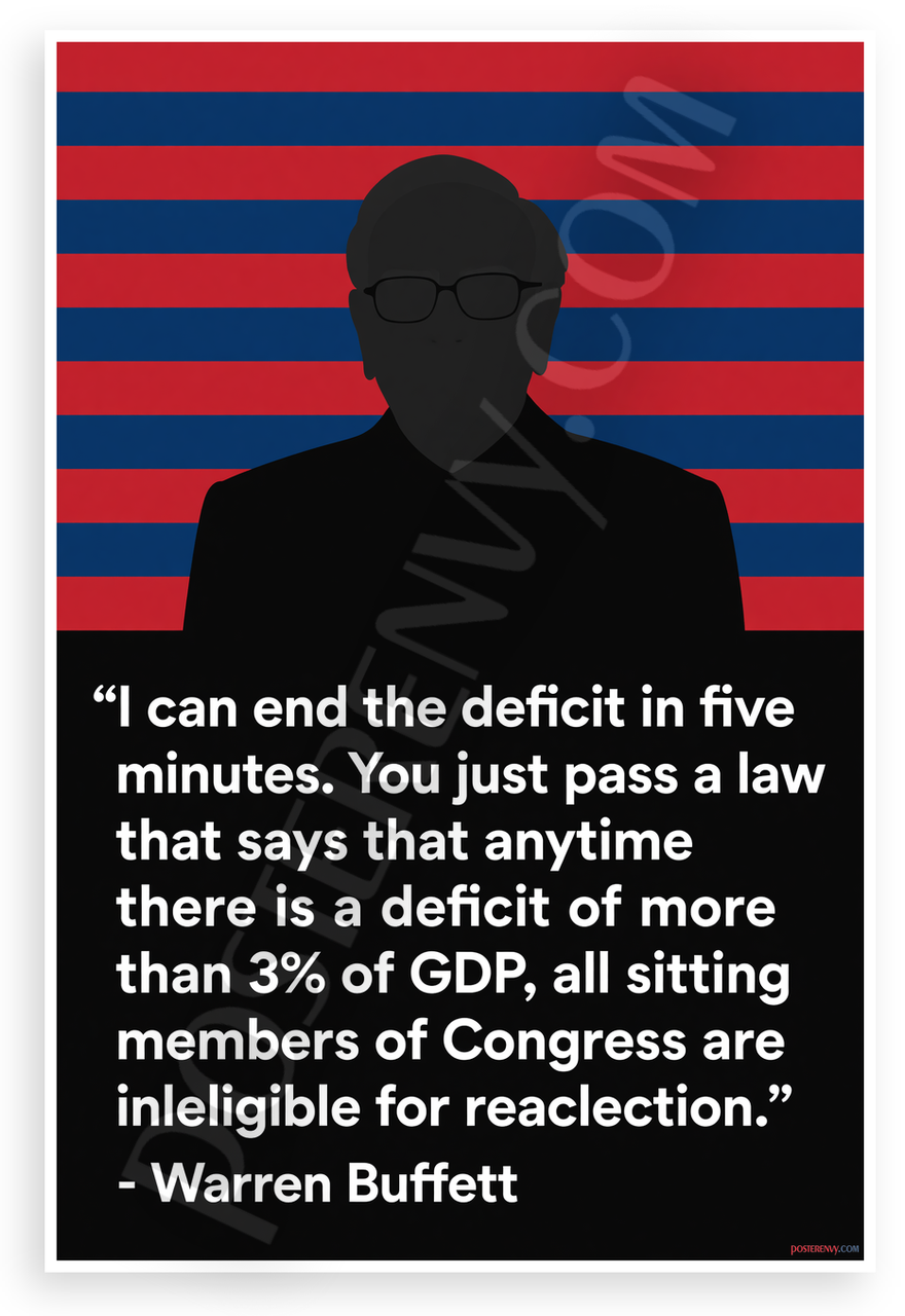 - Bold Political Silhouette: Stylized Warren Buffett profile over patriotic stripes with full deficit reelection quote creates empowering critique mood for office home study