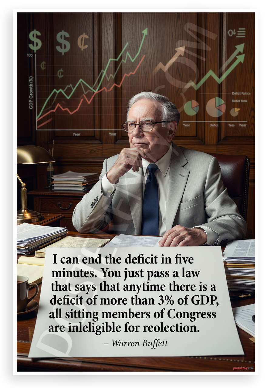 This 12x18 inch poster is printed on premium, durable paper. Proudly Made in the USA by PosterEnvy. The perfect size for any room. PosterEnvy is a family owned business, delivering top-notch posters around the world for over 20 years. Our posters are designed to last — they won't fade or pucker for years of enjoyment. Every poster features crisp, vivid artwork. We are a solar powered company. Featuring investor Warren Buffett in a contemplative office pose with economic charts and graphs in the background, alongside his bold quote on fiscal reform and Congress reelection rules.