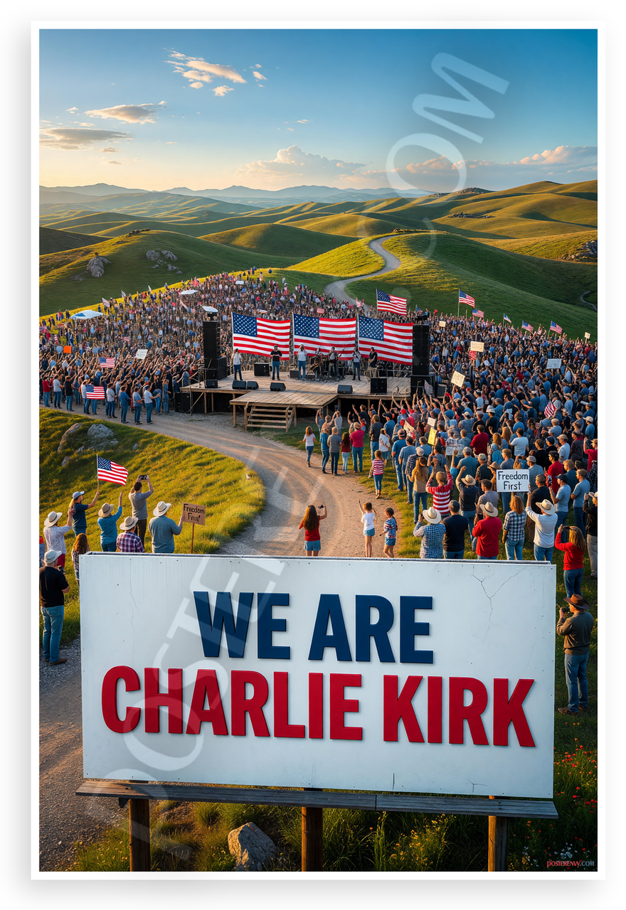 This 12x18 inch poster is printed on premium, durable paper. Proudly Made in the USA by PosterEnvy. The perfect size for any room. PosterEnvy is a family owned business, delivering top-notch posters around the world for over 20 years. Our posters are designed to last — they won't fade or pucker for years of enjoyment. Every poster features crisp, vivid artwork. We are a solar powered company. This striking poster captures a massive patriotic rally in vibrant green rolling hills under a sunset sky, with American flags waving, a stage packed with supporters, and the bold 'We Are Charlie Kirk' sign. Ideal for fans of conservative events and American pride.