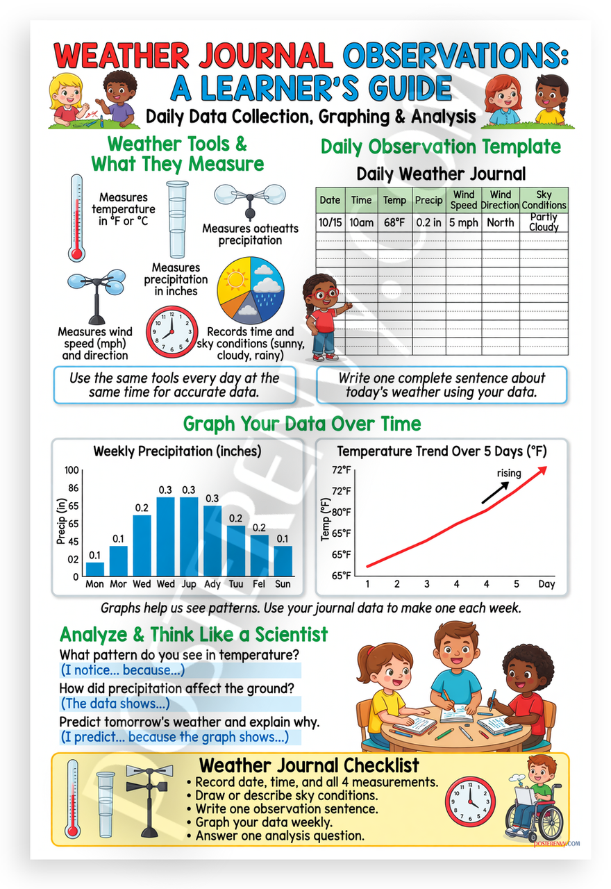 - Interactive Weather Learning: Bright cartoon-style design with diverse students, realistic tools, daily templates, weekly graphs, scientist thinking prompts, and checklist perfect for elementary science classrooms or homeschool study areas