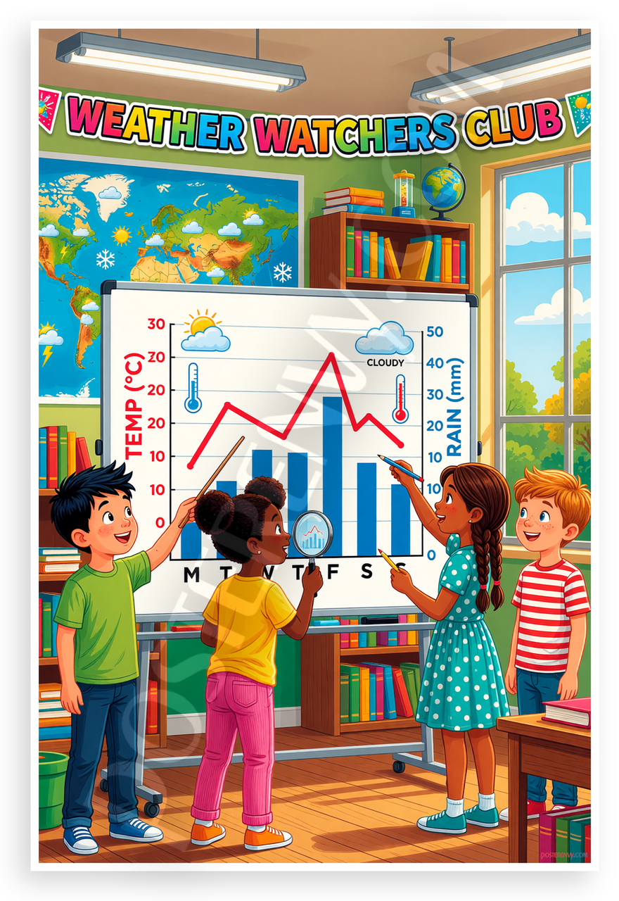 - Engaging Classroom Scene: Vibrant illustration of diverse children analyzing temperature graphs, rain bars, clouds, and sun symbols in a lively weather club room. Perfect for science walls, homeschool, or study areas