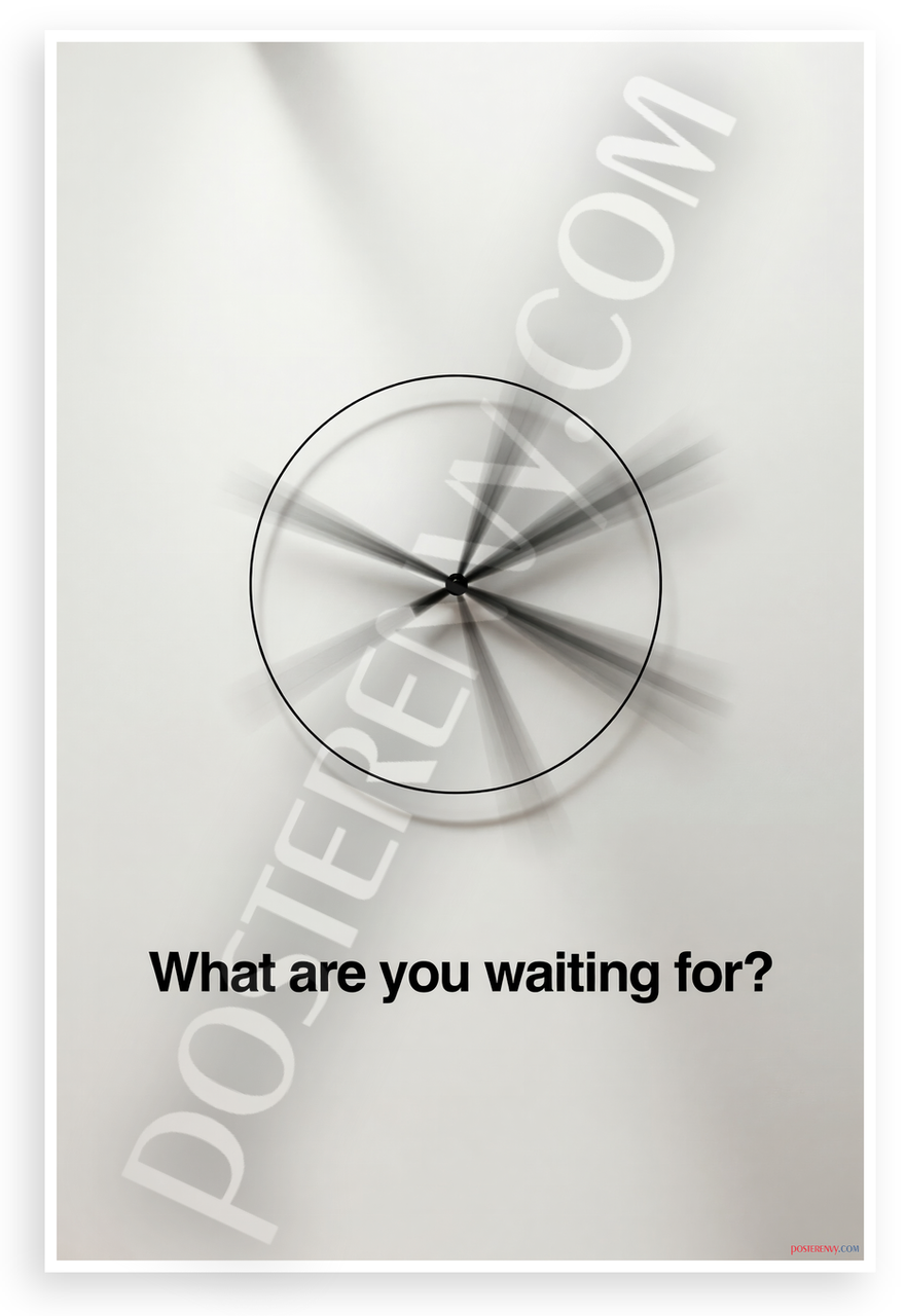 This 12x18 inch poster is printed on premium, durable paper. Proudly Made in the USA by PosterEnvy. The perfect size for any room. PosterEnvy is a family owned business, delivering top-notch posters around the world for over 20 years. Our posters are designed to last — they won't fade or pucker for years of enjoyment. Every poster features crisp, vivid artwork. We are a solar powered company. This minimalist design features an abstract clock with fast-moving hands symbolizing urgency and the passage of time, paired with the bold motivational text 'What are you waiting for?' Ideal for inspiring action.