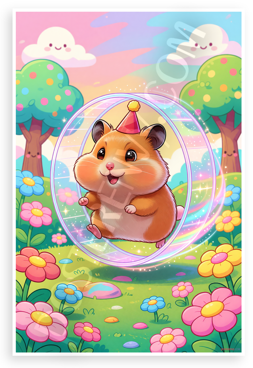 - Solar Powered Production: All our posters are designed and printed using solar energy, with crisp vivid artwork. Kawaii hamster, party hat hamster, magical wheel, fantasy garden scene, adorable pet poster