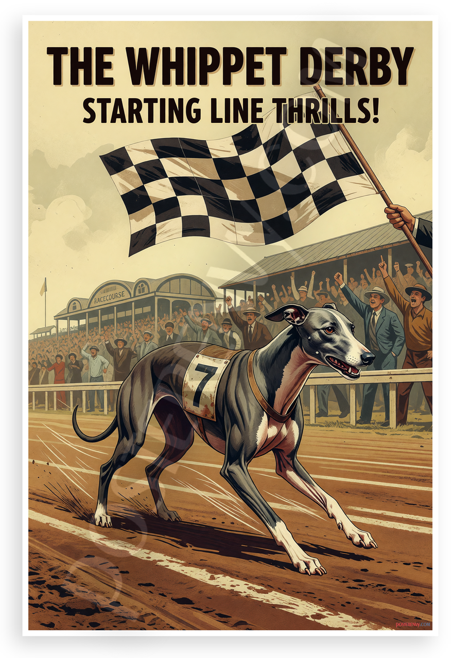 - Vintage Racing Excitement: Dynamic whippet dog sprinting from starting gate with checkered flag and cheering crowd in nostalgic sepia tones. Ideal for man caves, game rooms, or pet lover spaces