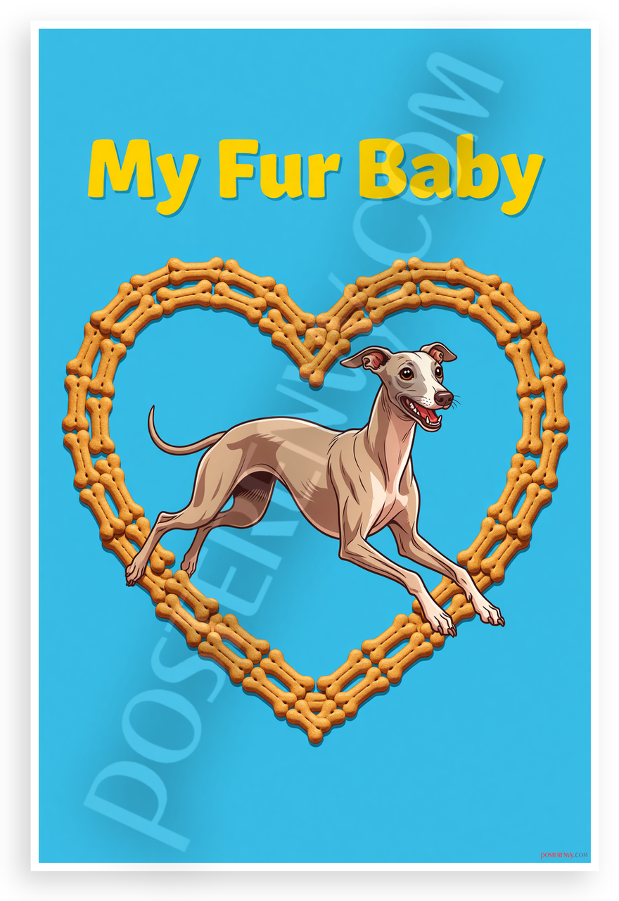This 12x18 inch poster is printed on premium, durable paper. Proudly Made in the USA by PosterEnvy. The perfect size for any room. PosterEnvy is a family owned business, delivering top-notch posters around the world for over 20 years. Our posters are designed to last — they won't fade or pucker for years of enjoyment. Every poster features crisp, vivid artwork. We are a solar powered company. This vibrant poster showcases a playful whippet leaping inside a heart frame of dog bones, with bold yellow 'My Fur Baby' text on a bright blue background, capturing modern digital pet love.
