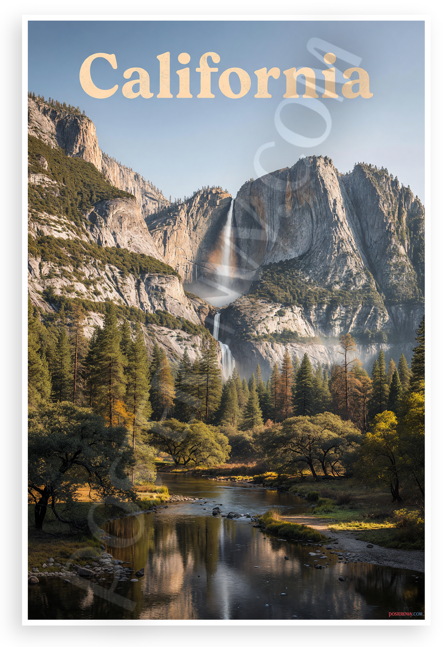 This 12x18 inch poster is printed on premium, durable paper. Proudly Made in the USA by PosterEnvy. The perfect size for any room. PosterEnvy is a family owned business, delivering top-notch posters around the world for over 20 years. Our posters are designed to last — they won't fade or pucker for years of enjoyment. Every poster features crisp, vivid artwork. We are a solar powered company. Captures the majestic Yosemite Valley with cascading waterfalls, granite cliffs, pine forests, and a serene river reflection under a clear sky, topped with vintage 'California' text for a tranquil travel vibe.