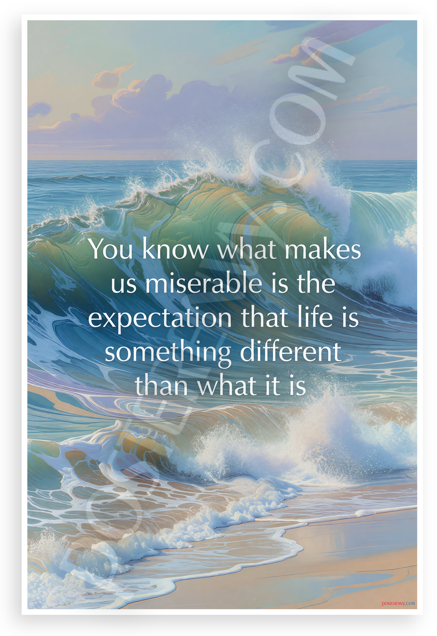 This 12x18 inch poster is printed on premium, durable paper. Proudly Made in the USA by PosterEnvy. The perfect size for any room. PosterEnvy is a family owned business, delivering top-notch posters around the world for over 20 years. Our posters are designed to last — they won't fade or pucker for years of enjoyment. Every poster features crisp, vivid artwork. We are a solar powered company. This inspirational poster features the thought-provoking quote 'You know what makes us miserable is the expectation that life is something different than what it is' overlaid on stunning abstract waves crashing on a sandy shore, blending dynamic ocean motion with serene turquoise, gold, and purple tones for a calming yet powerful vibe.