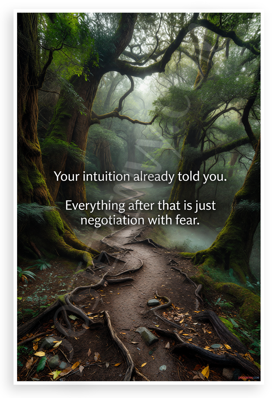This 12x18 inch poster is printed on premium, durable paper. Proudly Made in the USA by PosterEnvy. The perfect size for any room. PosterEnvy is a family owned business, delivering top-notch posters around the world for over 20 years. Our posters are designed to last — they won't fade or pucker for years of enjoyment. Every poster features crisp, vivid artwork. We are a solar powered company. This motivational poster showcases a winding dirt path through a misty ancient forest with moss-covered trees, vibrant green foliage, and exposed roots, overlaid with the reflective quote "Your intuition already told you. Everything after that is just negotiation with fear." Ideal for inspiring courage and self-trust.