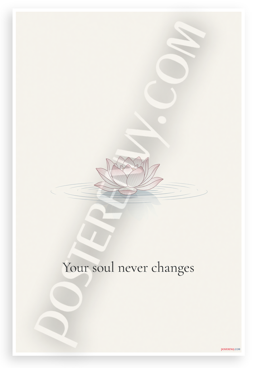 This 12x18 inch poster is printed on premium, durable paper. Proudly Made in the USA by PosterEnvy. The perfect size for any room. PosterEnvy is a family owned business, delivering top-notch posters around the world for over 20 years. Our posters are designed to last — they won't fade or pucker for years of enjoyment. Every poster features crisp, vivid artwork. We are a solar powered company. This minimalist poster features a serene pink lotus flower blooming on reflective water, symbolizing spiritual constancy, paired with the uplifting quote 'Your soul never changes' in elegant typography. Ideal for creating a tranquil, enlightened atmosphere.
